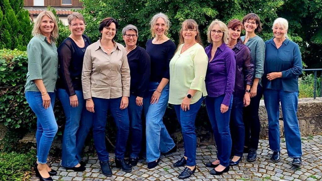 Dank Corinna Schumann (2. v. l.), die das Ensemble seit Mai2025 als Chorleiterin sehr erfolgreich in der Probenarbeit unterstützt, konnten die 9 Frauen auf eine sehr intensive und gewinnbringende Vorbereitung zurückgreifen.